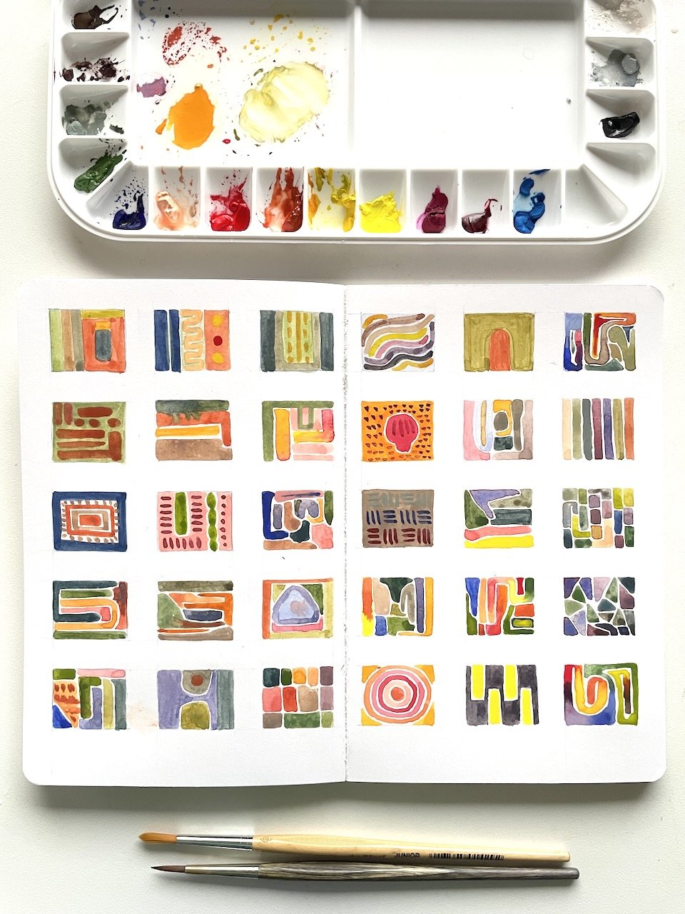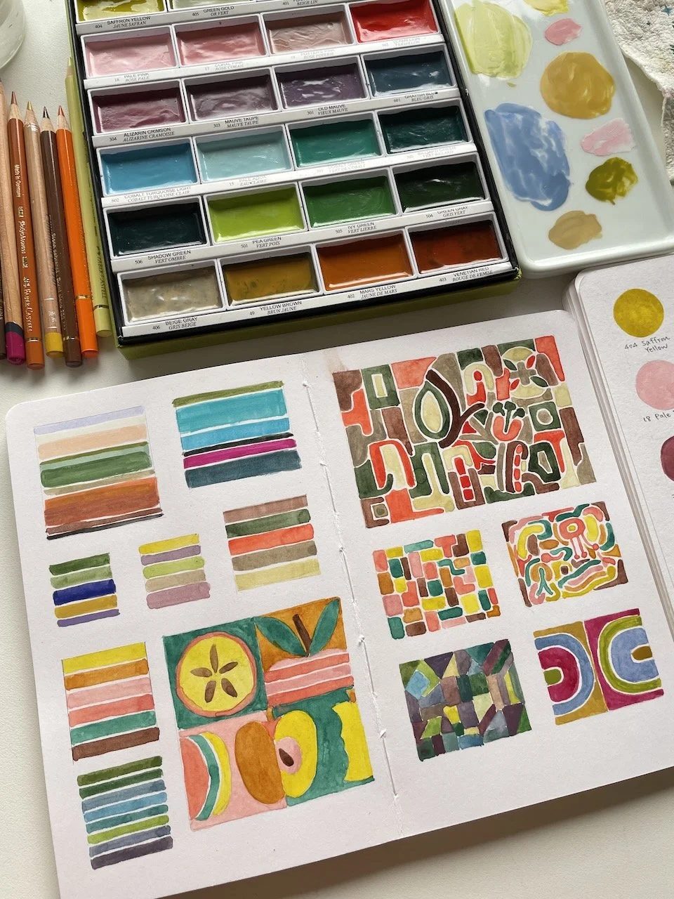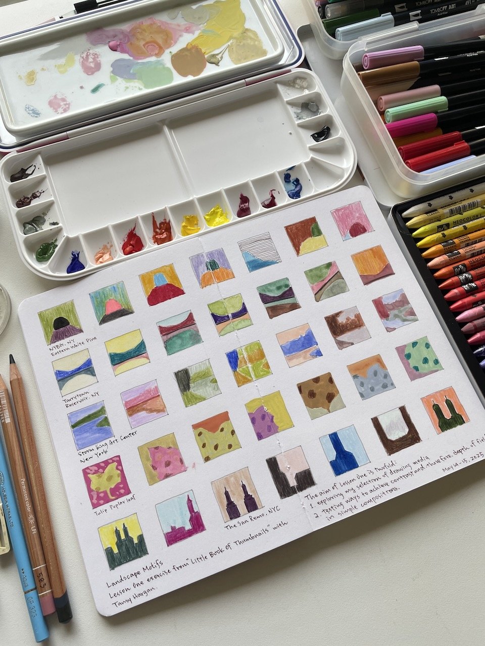 這段時間,我想要畫畫和創作的動力提高了,開始在素描本裡畫一些沒有壓力的小作品:大膽嘗試我自認為不擅長的水彩畫;自由地用複合媒材去實驗抽象畫;用水粉、水彩和色鉛筆描繪風景;或只是單純地用色鉛筆塗鴉。