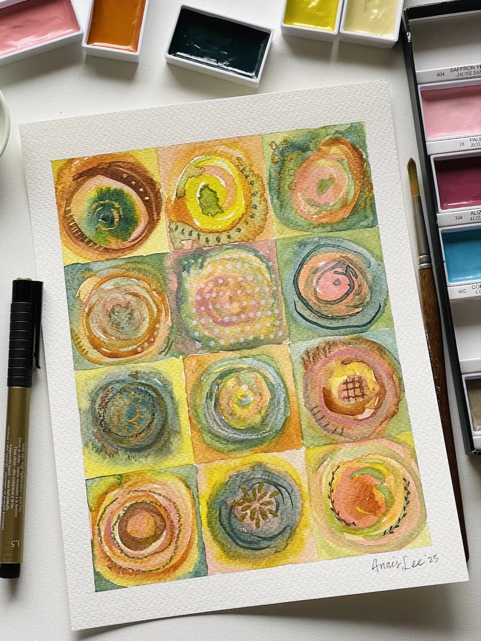 有時,我會花好幾個小時,反覆畫著一些「畫了也不知道能幹嘛」的小方格或同心圓。這些創作過程,讓我感受到一種像瑜伽或靜坐般的平靜與安定。
